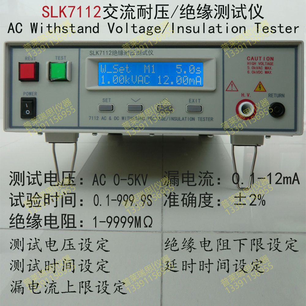 SLK7112程控耐压绝缘测试仪,适用于家用电器、电源开关、电线电缆、变压器、接线端子、高压胶木电器、电机、医疗、化工、仪器仪表 (1)耐压范围0~5kV(AC) (2)漏电流 0.10~12.00mA (3)绝缘电阻:1-1000MΩ (4)准确度:± 2% ≥500V DC ±5%<500V DC (5)绝缘电阻:1000-9999MΩ (6)准确度:±5% ≥500V DC ±10%<500V DC (7)电流上下限设定 (8)前面板软件校 正 (9)LCD液晶显示、菜单引导操作 (10)具有电弧侦测功能(1-9级) (11)键盘锁定功能 (12)5组测量记忆模式 (13)测试时间、电压、电流、电阻同时显示 (14)PLC 、RS232接口,可选配电脑软件,另配置扫描仪,实现光伏组件的高效率测试.适用于家用电器、电源开关、电线电缆、变压器、接线端子、高压胶木电器、电机、医疗、化工、仪器仪表