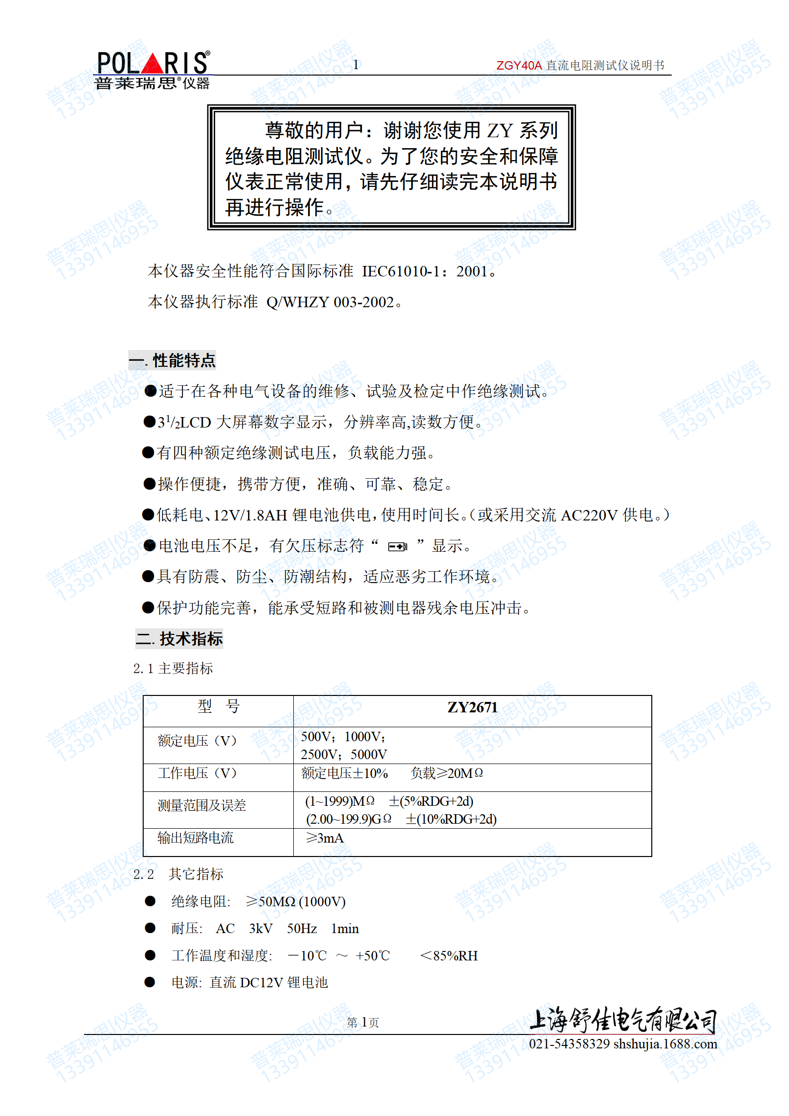 2LCD屏幕数显,500V/1000V/2500V/5000V,负低耗电、12V/1.8AH锂电池/AC220V供电。能承受短路和被残余电压冲击。